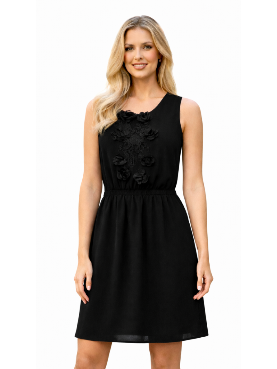 Vestido Corto Manga Cero de Gasa con Bordado en el Pecho - Negro
