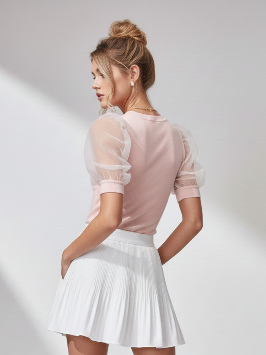 Blusa Tejida con Manga Corta de Organza - Rosado