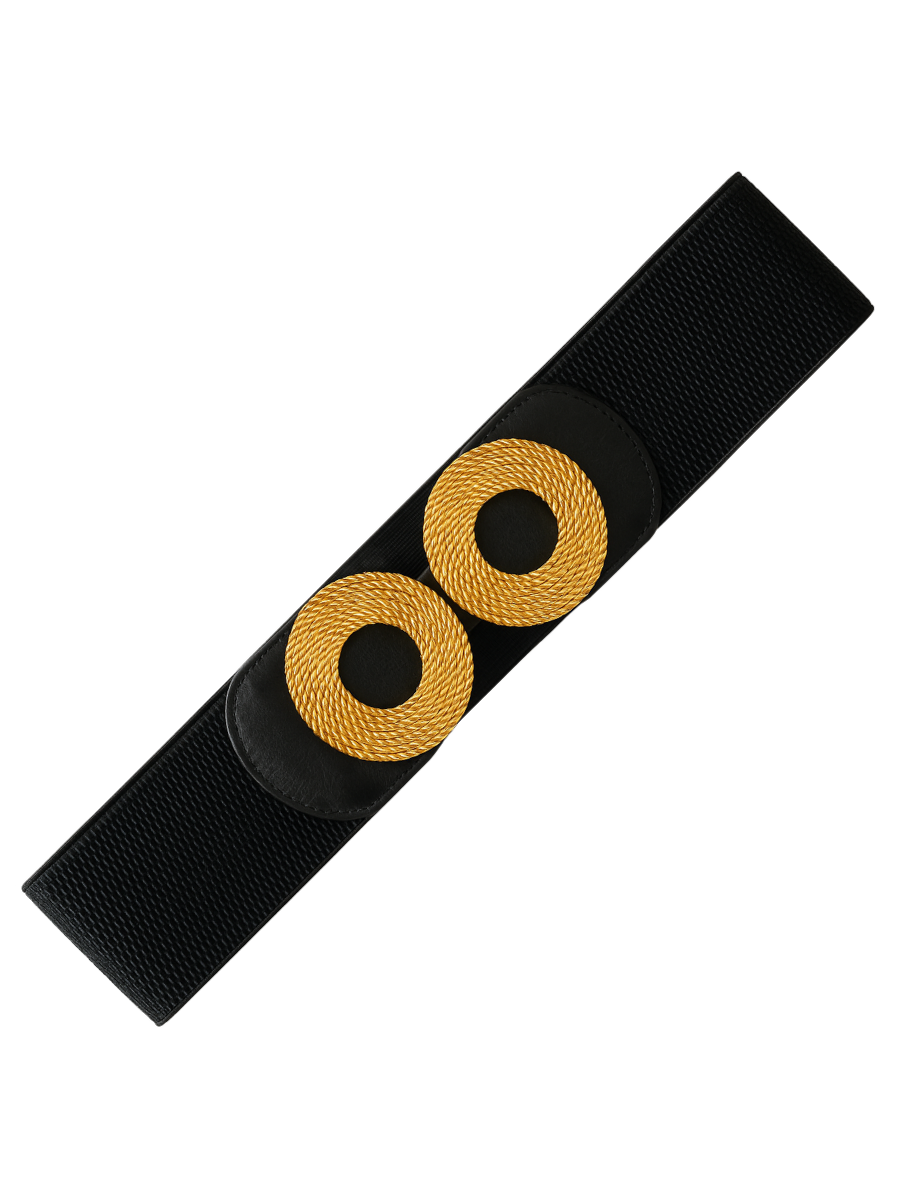 Su diseño elástico negro garantiza comodidad y ajuste perfecto, mientras la hebilla dorada circular doble, aporta brillo y un toque distintivo de sofisticación. Perfecta para transformar un atuendo básico en un look elegante, esta correa es un accesorio versátil que aporta estilo y distinción sin esfuerzo.