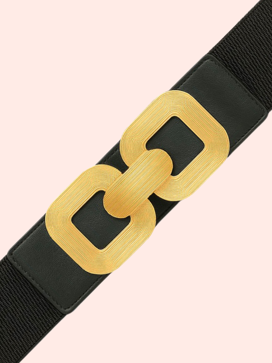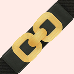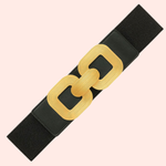 Su diseño elástico negro garantiza comodidad y ajuste perfecto, mientras la hebilla dorada de dos cuadrados aporta brillo y un toque distintivo de sofisticación. Perfecta para transformar un atuendo básico en un look elegante, esta correa es un accesorio versátil que aporta estilo y distinción sin esfuerzo.