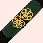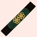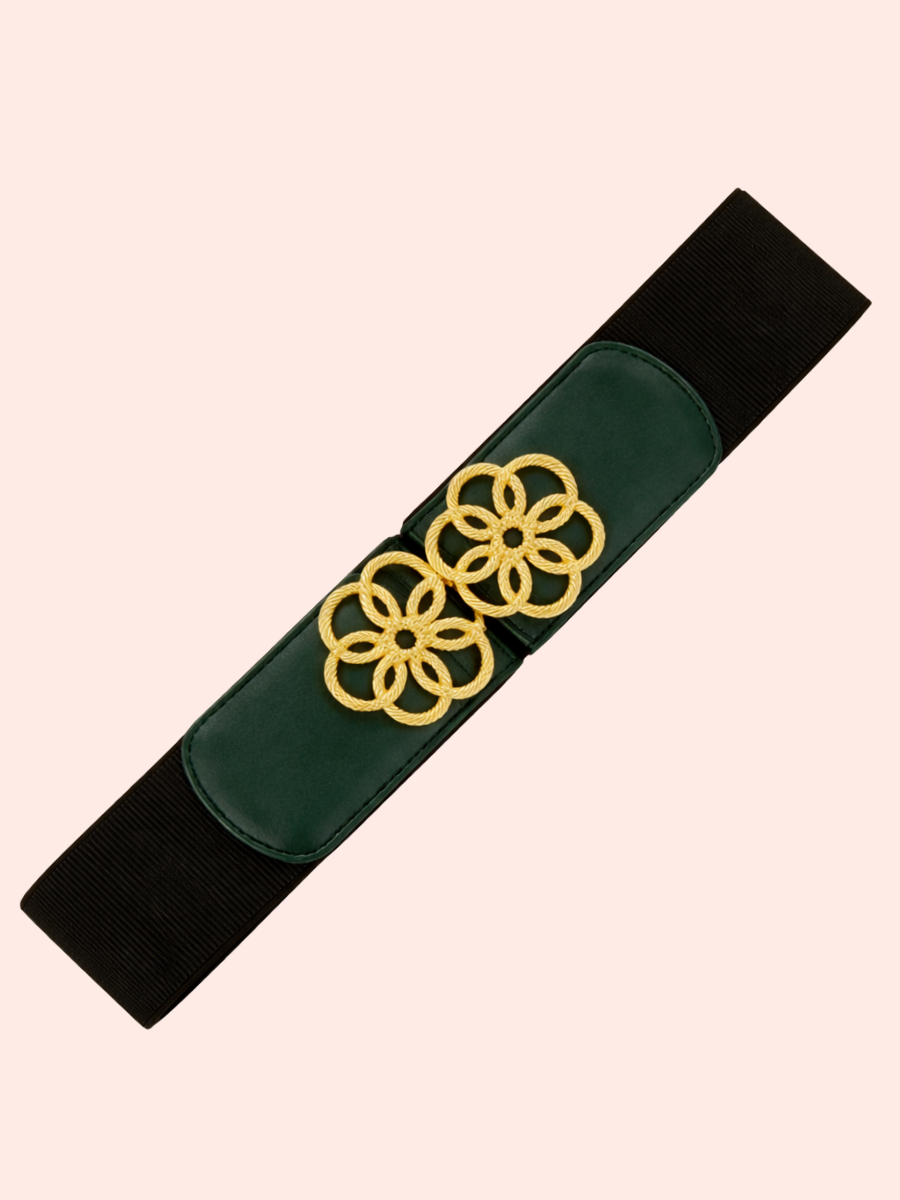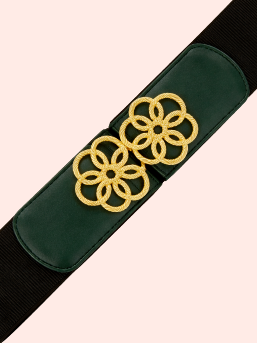 Su diseño elástico negro garantiza comodidad y ajuste perfecto, mientras la hebilla dorada con hebilla multi-círculos que aporta brillo y un toque distintivo de sofisticación. Perfecta para transformar un atuendo básico en un look elegante, esta correa es un accesorio versátil que aporta estilo y distinción sin esfuerzo.