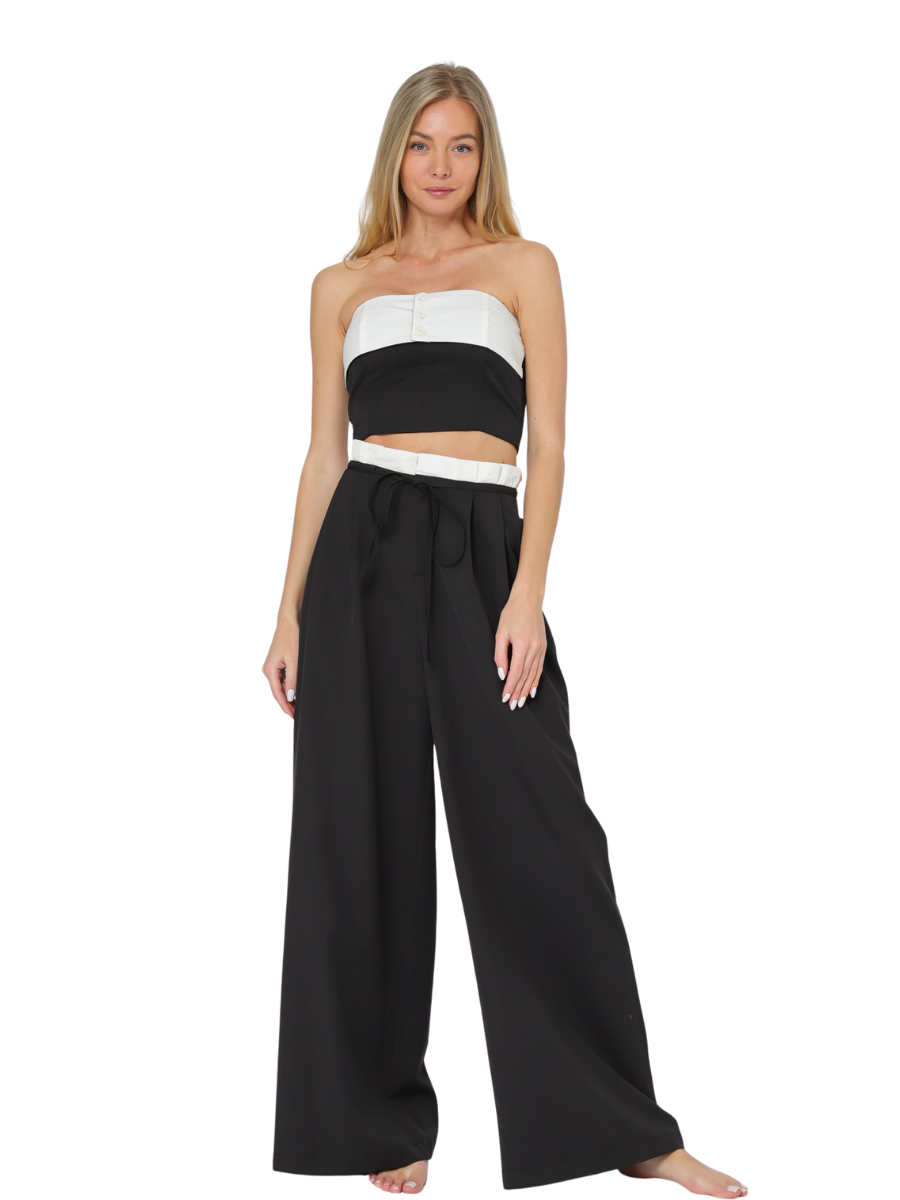 Pantalón Palazzo Linda – Corte Amplio con Pretina Elástica Blanca – Negro y Blanco