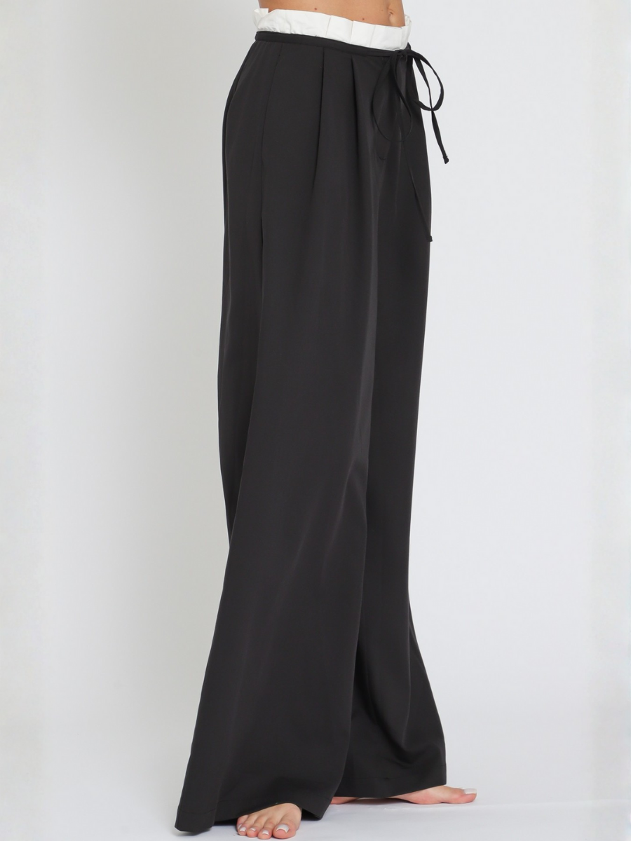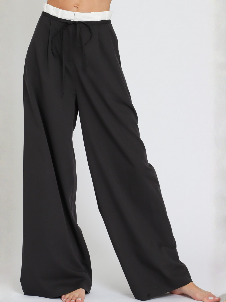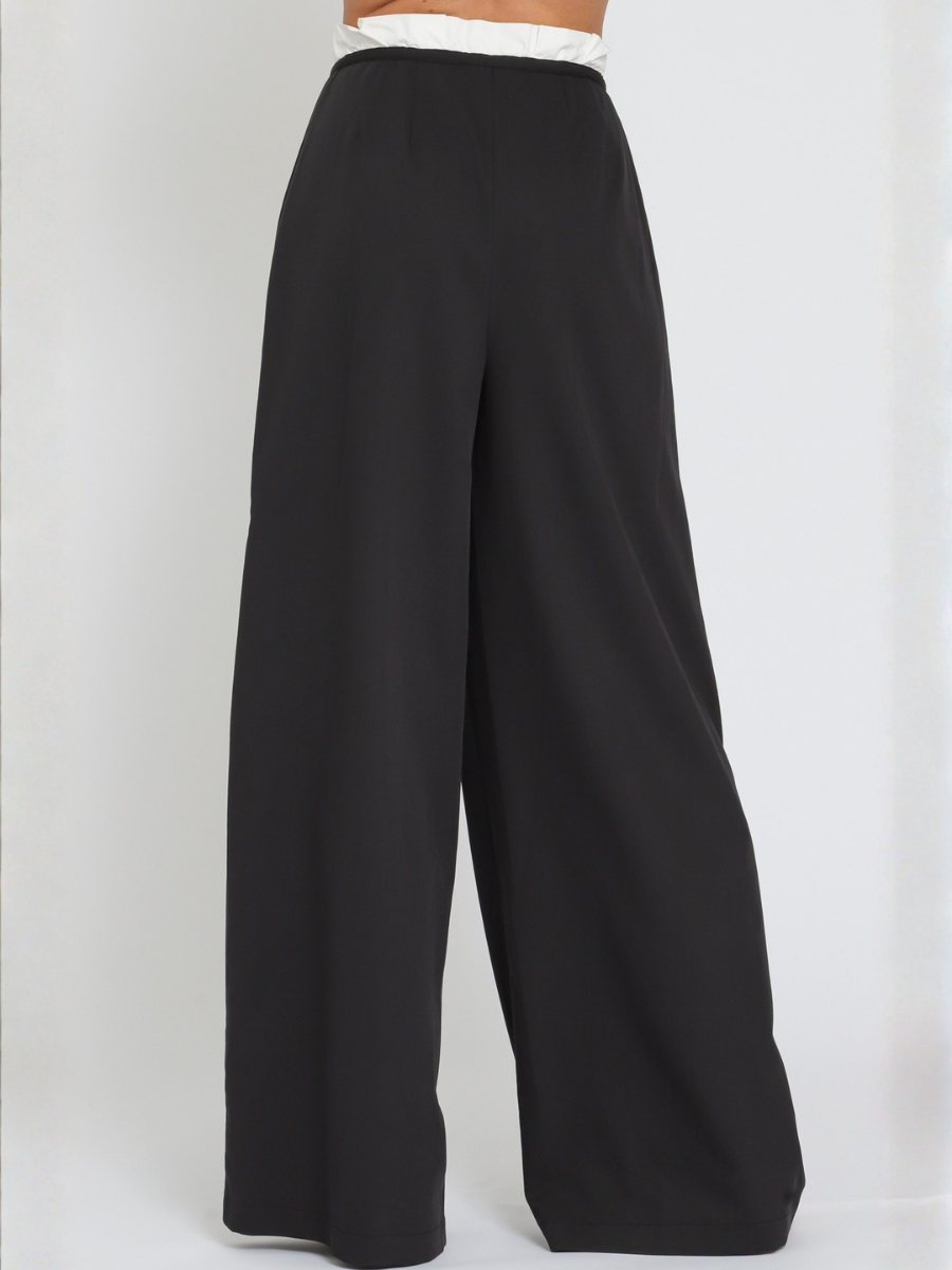 Búsqueda: Pantalón palazzo, pantalón amplio, pantalón de mujer, pantalón elegante, pantalón moderno, pantalón cómodo, pantalón de vestir, pantalón con pretina elástica, pantalón con contraste, pantalón fluido, pantalón sofisticado, pantalón casual, pantalón de tendencia, pantalón femenino, ropa femenina.