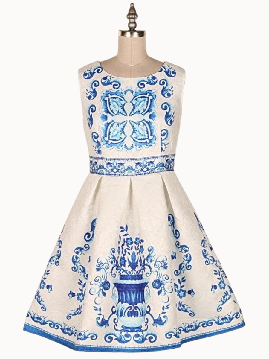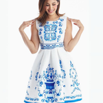 Vestido Corto con Estampado de Azulejos y Falda en Corte A - Blanco con Azul