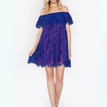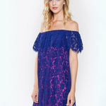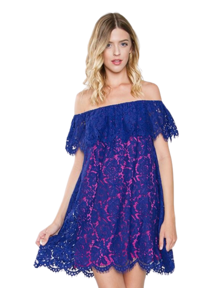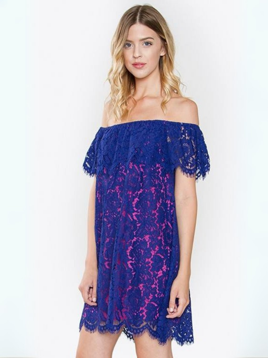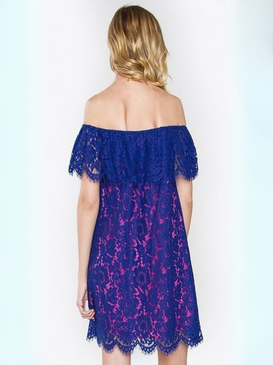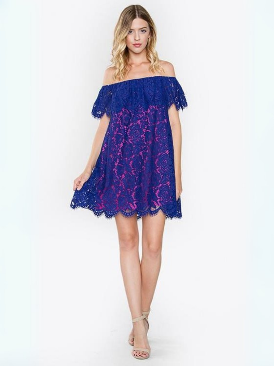 Vestido Corto Off-Shoulder de Encaje Azul Eléctrico con Fustán Fucsia - Azul