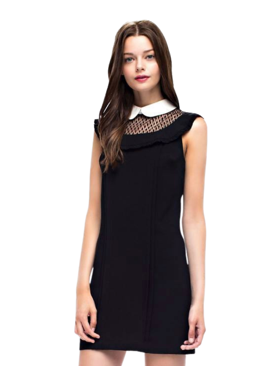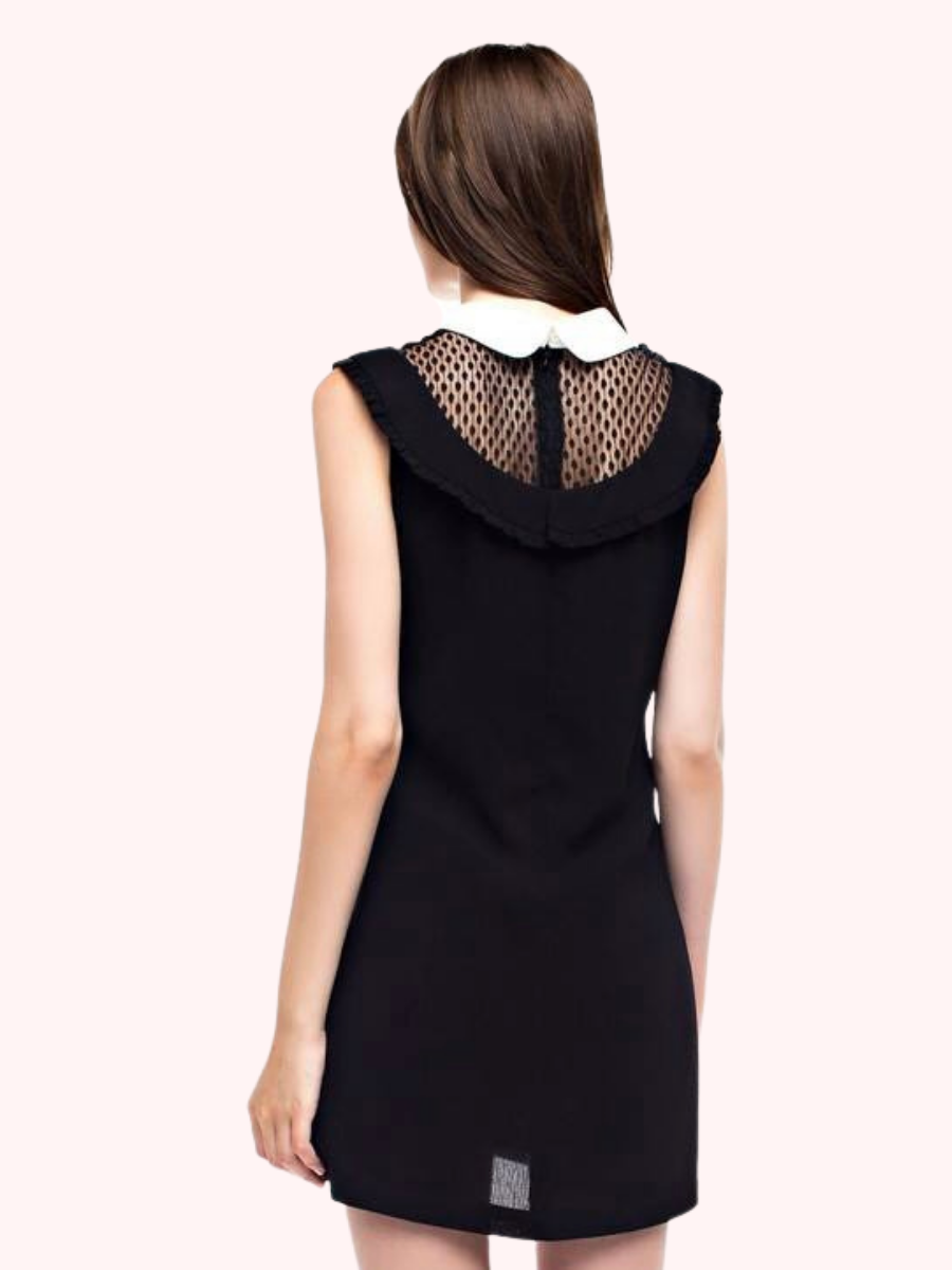 Nuestro vestido destaca por su silueta corta y estructurada, realzada por el contraste del cuello camisero blanco sobre la base negra. Su detalle en malla transparente con volantes en la parte superior aporta textura y feminidad, mientras el corte recto estiliza la figura con un aire sobrio y moderno. Su diseño sin mangas ofrece comodidad, ideal para acompañar con tacones o botines y crear un look elegante en cualquier temporada.
