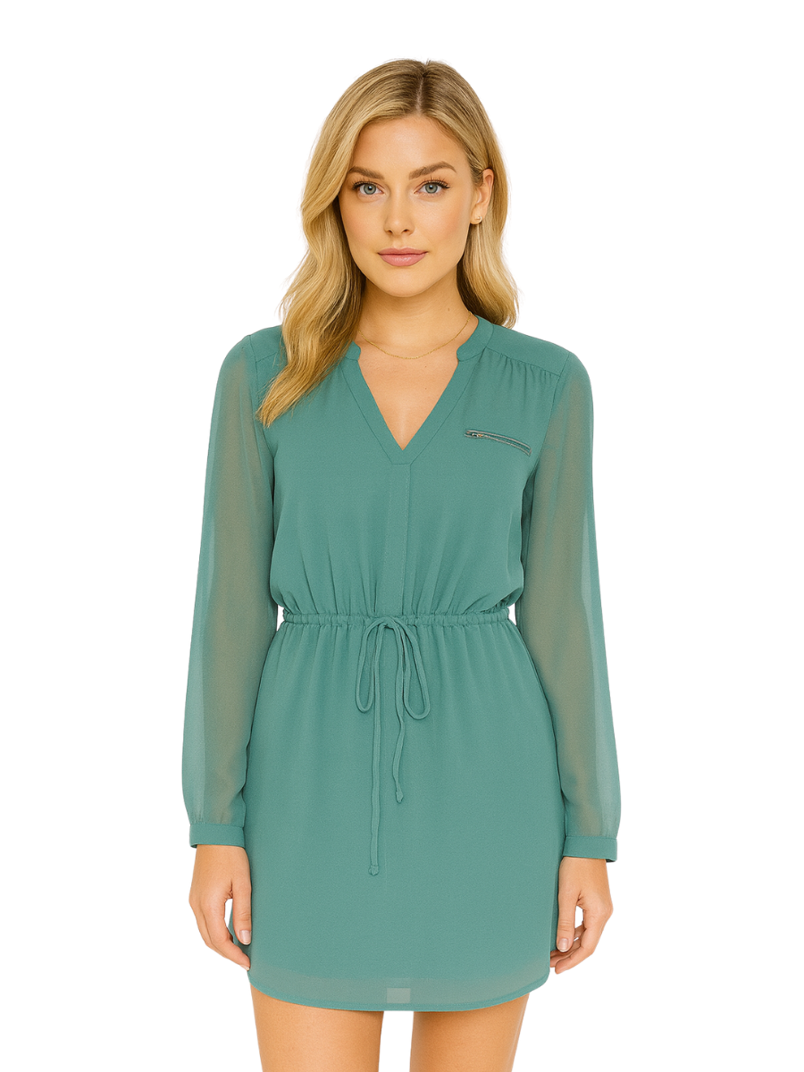 Disfruta de la ligereza de nuestro vestido confeccionado en gasa fluida color verde jade. Su escote en V favorece la figura, mientras la cintura ajustable con lazo permite definir la silueta con un toque femenino. Las mangas largas semitransparentes añaden elegancia y movimiento, y el detalle metálico discreto en el pecho aporta un aire moderno y sutilmente sofisticado.