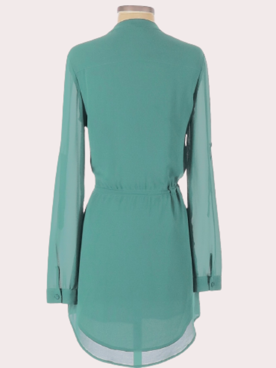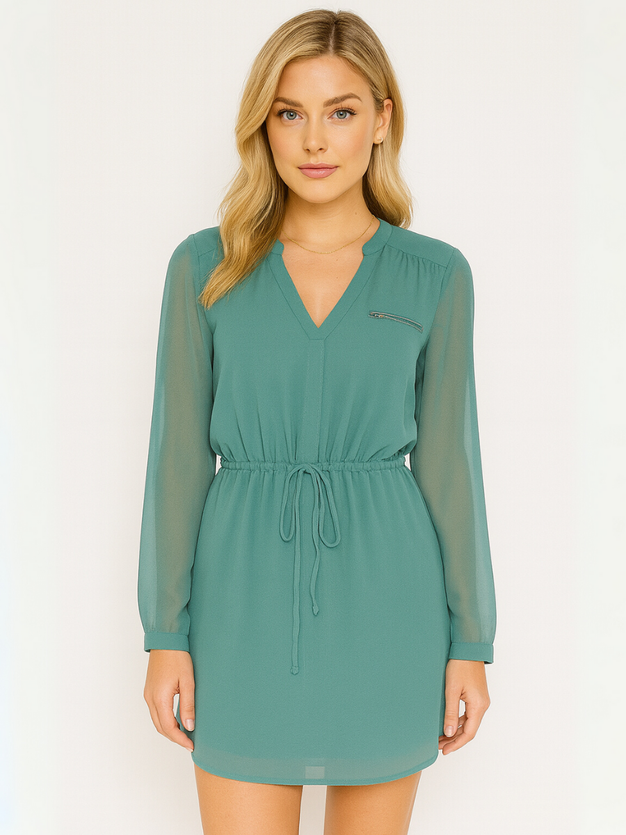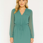 Vestido Corto de Gasa con Manga Larga y Cintura Ajustable - Verde
