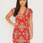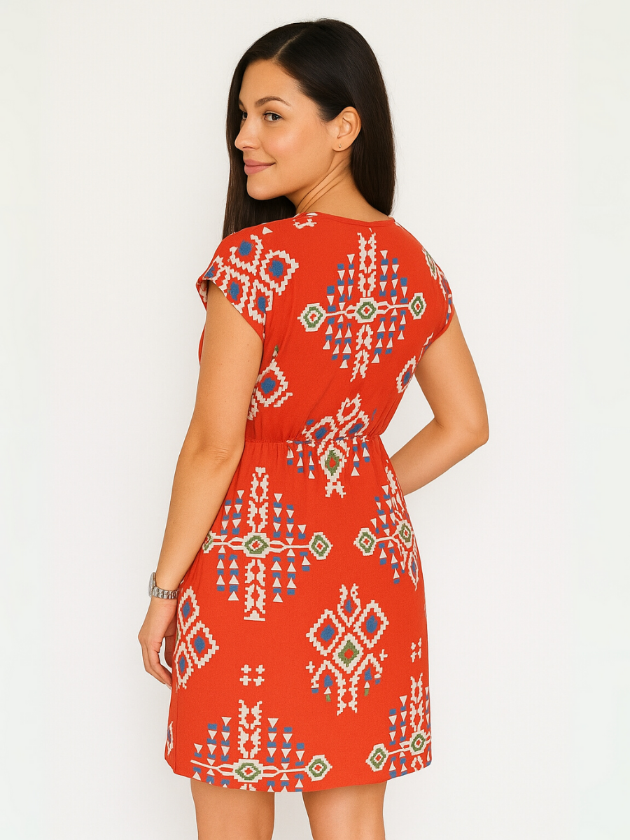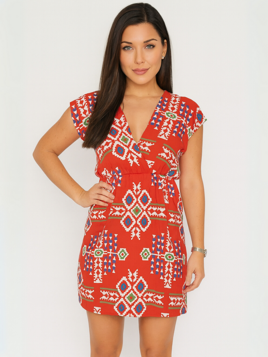Vestido Corto con Escote en V y Estampado Geométrico - Rojo
