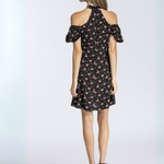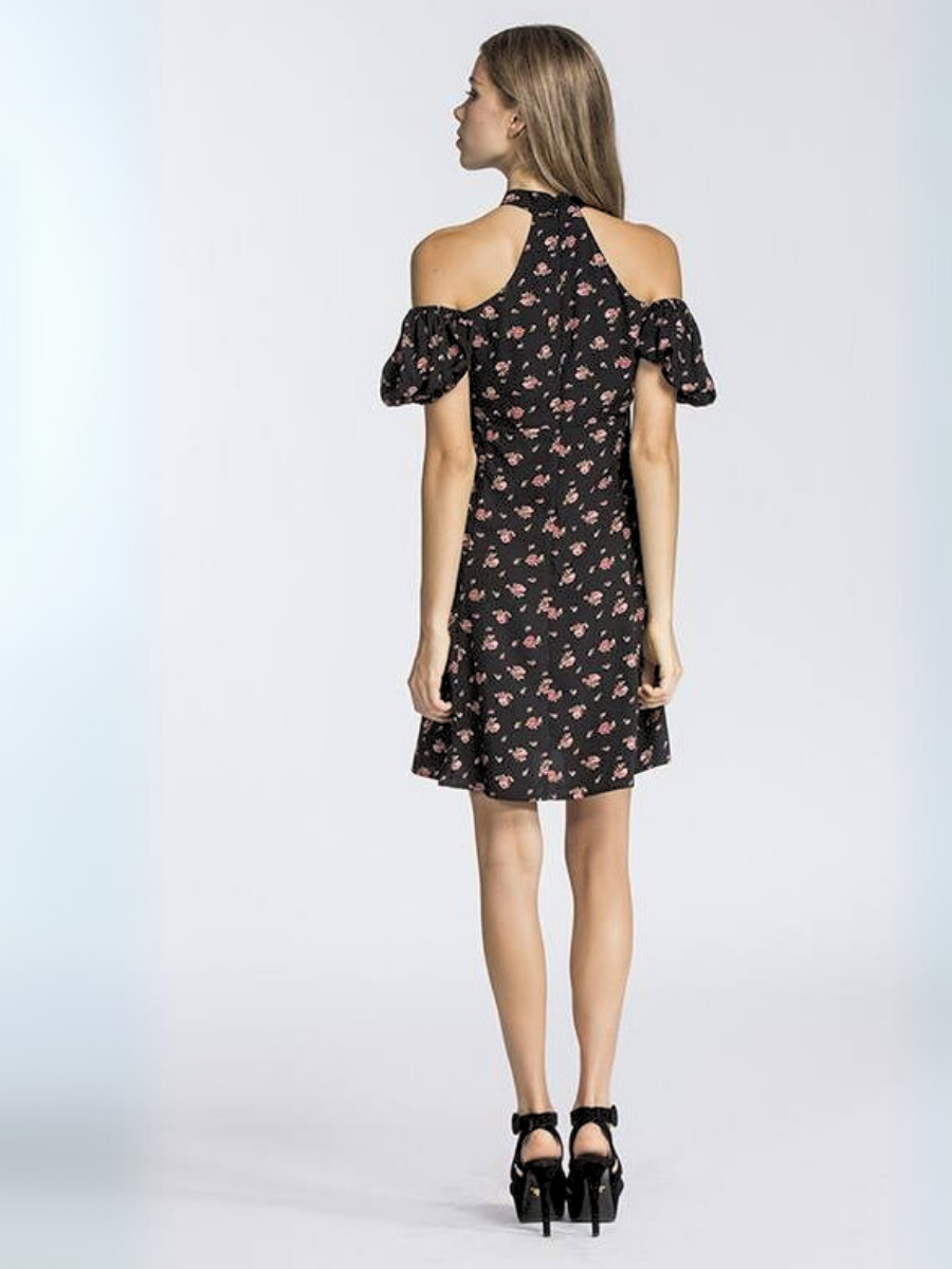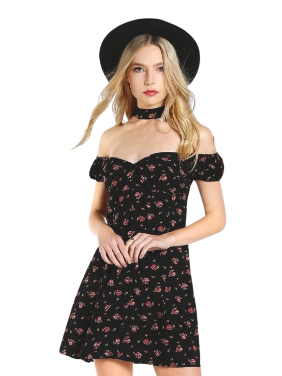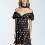 Vestido Corto Off-Shoulder con Mangas Abullonadas, Escote Corazón y Choker Floral - Negro