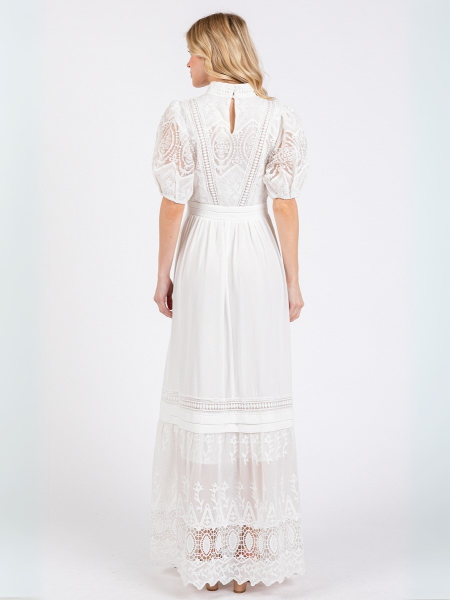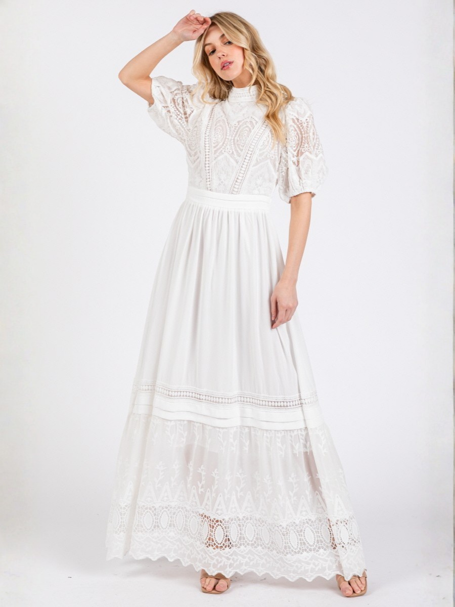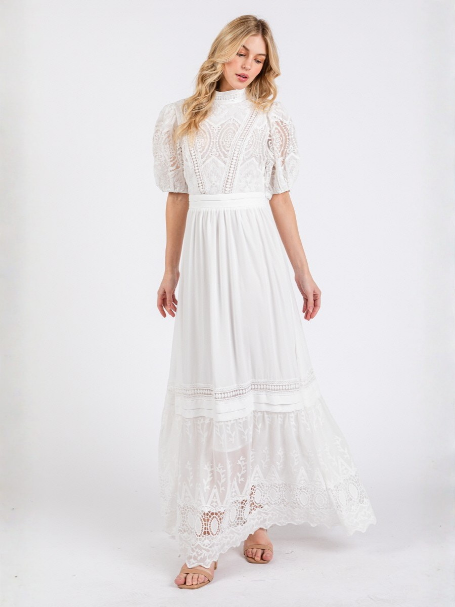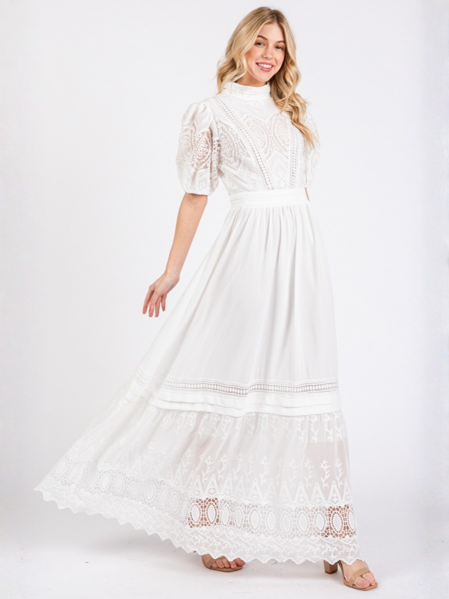 Vestido Maxi Erika – Largo de Encaje con Cuello Alto Romantic – Blanco
